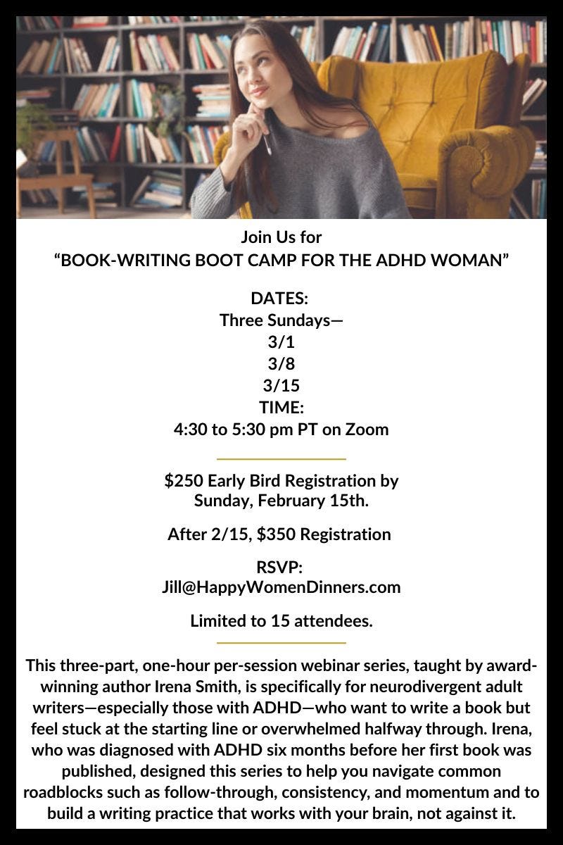 •If you read this entire post and found yourself thinking, You know what would be great? Taking a writing class with this woman!, you’re in luck, because this March, I will be teaching a three-part virtual class for neurodivergent adult writers (particularly women with ADHD, of whom I am one). If you’re stuck mid-project or simply can’t get started, this class will provide a supportive community to help you build a writing practice that actually works. The early bird registration rate ends this Sunday!
